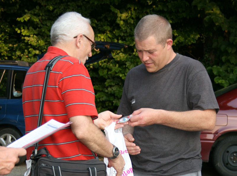 Der Betreuer der Auslandschweizer, Paul Gantenbein, übergibt Markus Lüscher für das Höchstresultat von 97 Punkten eine Medaille.